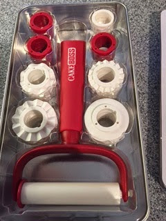 Cake Boss that my boyfriend gave me for Christmas. It's a great little set that comes in a metal tin, consisting of a roller with a handle, and various wheels that give you different width and style ribbons, such as straight or wavy.