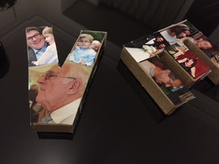 This was much faster to make than you might think - I actually did it on the kitchen counter while I was cooking dinner! I simply cut up the collage print, selecting pictures that would fit on each part of each letter and glued them on. I covered the edges with offcuts of photos as you won't really see these, but I didn't want to leave them blank. I didn't bother covering the backs of the letters though.