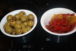 Antipasti: red peppers from a jar (v); stuffed olives (v); sliced salami and prosciutto
