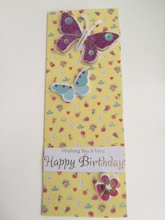 This card was a bit of a cheat as it uses elements from a shop-bought birthday card (one I received)- but I do like to recycle! I used a tall thin card blank and covered it with a pretty yellow paper patterned with little flowers. I cut the butterflies and the flower off the other card – they are made of foam backed onto cardboard so were easy to cut out and look really nice as they are raised off the card. The ‘happy birthday’ banner is also recycled from another card!
