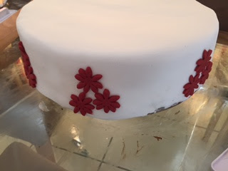 I was going to leave the chocolate layer undecorated apart from the ribbon but I really struggled to cover a cake that size in fondant. I did the best I could but there were a few areas where I wasn't entirely happy with the fondant so I decided to add some red flowers - I had been thinking there wasn't enough red on the cake.