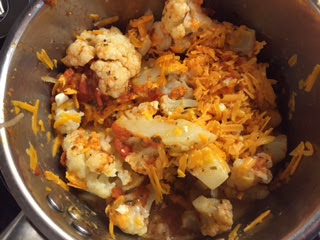 Meanwhile spray a frying pan with oil, and fry the cauliflower, onion and garlic and add the stock. Cook for 10-12 minutes. Allow to cool, then in herbs, half the cheese, and the beaten egg.