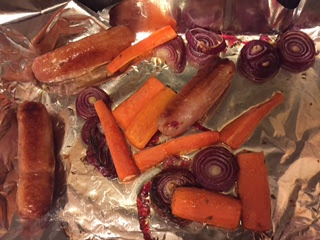 Preheat oven to 200C. Line a roasting tin with foil and put the sausages, carrots and onions in the pan and toss with the cumin, coriander and oil. Roast for 30 minutes, turning halfway, until cooked through.